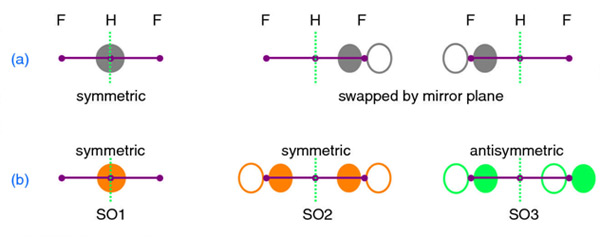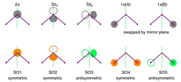 Figure 4.7 shows that by combining the two AOs with no symmetry an in-phase symmetric orbital (SO2) results, as well as an out-of-phase antisymmetric SO (SO3).