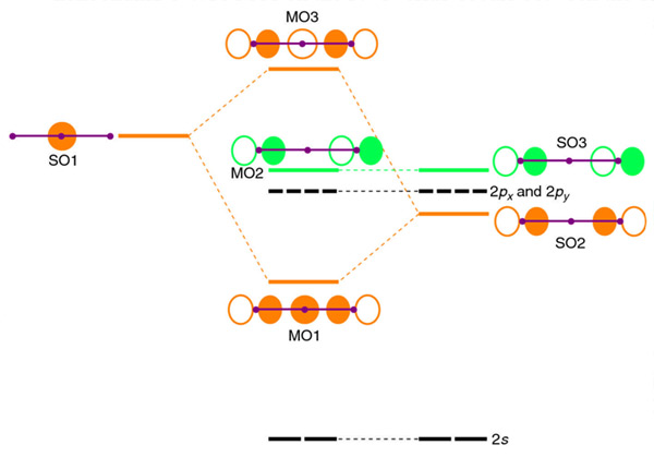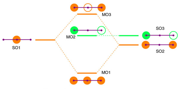 Figure 4.4 shows the resultant MO diagram for linear H3+. Interaction between the symmetric SO1 and SO2 gives bonding MO1 and antibonding MO3, while antisymmetric SO3 has no other orbitals to overlap with, and forms a weakly antibonding MO2.