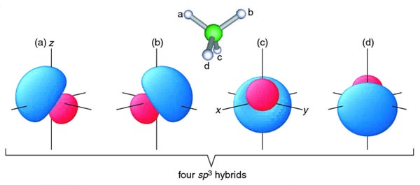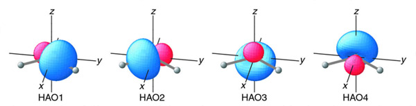 For methane sp3 HAOs, the 2s and three 2p AOs on carbon combine. Four HAOs result and are represented in Figure 4.18. The direction of each HAO varies (109.5o between any two hybrids), but the energies and shapes are identical. The energy of each HAO lies between that of the 2s and 2p AOs, but closer to the 2pbecause sp3 is 75% 2p character. Each HAO has both a major (blue) and a minor (pink) lobe.
