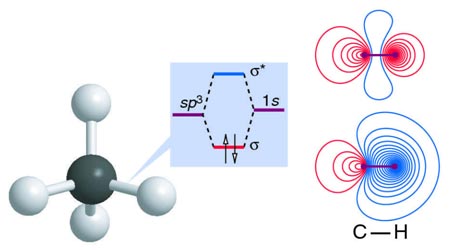 Overlap then occurs between each HAO and the 1s on each H, to give bonding and antibonding σ and σ* MOs, as shown in Figure 4.20. This means that the bonding is localized between each C-H, rather than delocalized as in the full and accurate MO description.