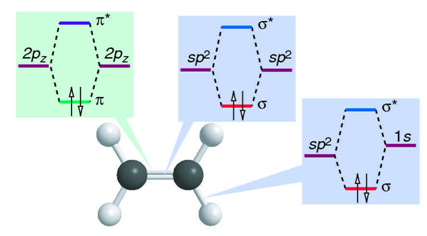 Overlap then occurs between each HAO and the 1s on each H and the sp2 on the second carbon, to give bonding and antibonding σ and σ* MOs, as shown in Figure 4.26. Also the two out-of plane 2pz AOs overlap to form bonding and antibonding π and π* MOs. Again the bonding is localized between each C-H and C-C, rather than delocalized as in the full and accurate MO description.