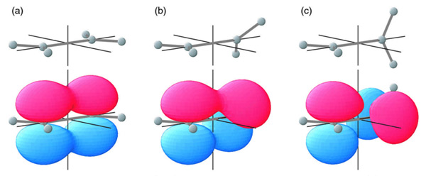 For double-bonded ethene, sp2 HAOs are assumed. These are a combination of 2s and two 2p AOs on carbon. The shapes of the resultant three HAOs and the unhybridized 2pz AO are represented in Figure 4.24. The direction of each HAO varies (120o between any two hybrids), but the energies and shapes are identical. The energy of each HAO lies between that of the2s and 2p AOs, but closer to the 2p because sp3 is 67% 2p character. Each HAO has both a major (blue) and a minor (pink) lobe.