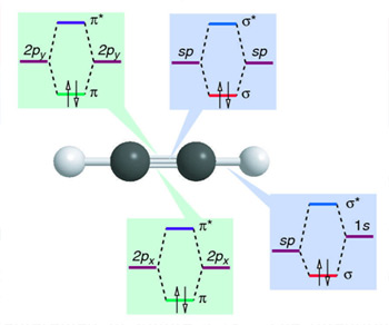 MOs from overlap of 2px and 2py AOs on C, sp HAOs on C and sp on C with 1s on H for ethyne.