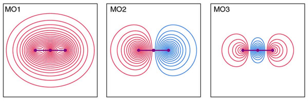 Figure 4.5 shows contour plots of the MOs. All three orbitals have cylindrical symmetry (there are no other possibilities for this linear arrangement of atoms!), and are hence σ orbitals. MO1 is bonding with no nodes, while MO2 and MO3 are antibonding with one and two nodes respectively. Notice that the energy of these MOs increases with increasing numbers of nodes