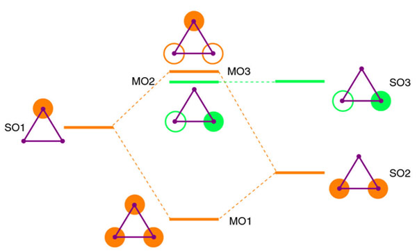 Experiment has shown that triangular H3+ is the most stable geometry. All vertices are equivalent in an equilateral triangle and so all atoms have the same symmetry. By choosing one mirror plan, the ion has one symmetric 1s AO (SO1) and two AOs with no symmetry (see Figure 4.6).