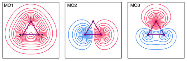 For the triangular H3+ tion, the two electrons will again occupy the lowest energy orbital, and the MO1 is lower than the MO1 for linear H3+. As a consequence, H3+ is expected to be triangular. This orbital is delocalised over all three atoms; three nuclei are bound by a single electron pair.